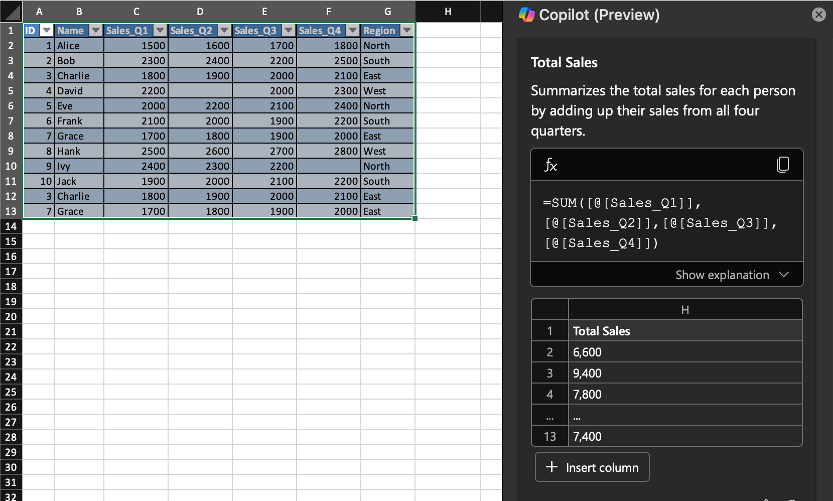 Reikia paminėti, kad „Copilot“ pats siūlo perkeitimus, kaip, tarkim, pridėti naują skaičiuojamąjį stulpelį, kurį pats gali įterpti, kaip pvz. visų ketvirčių pardavimų suma (Total Sales).